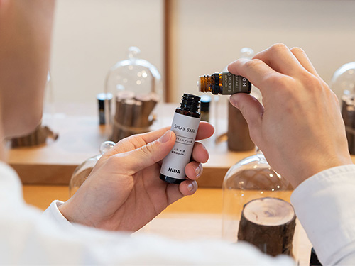 スプレーベースに店頭に並ぶ自社製造の100%天然・無添加の精油のテスターの中からお好きな精油をブレンドして、オリジナルのアロマスプレーが作れます。