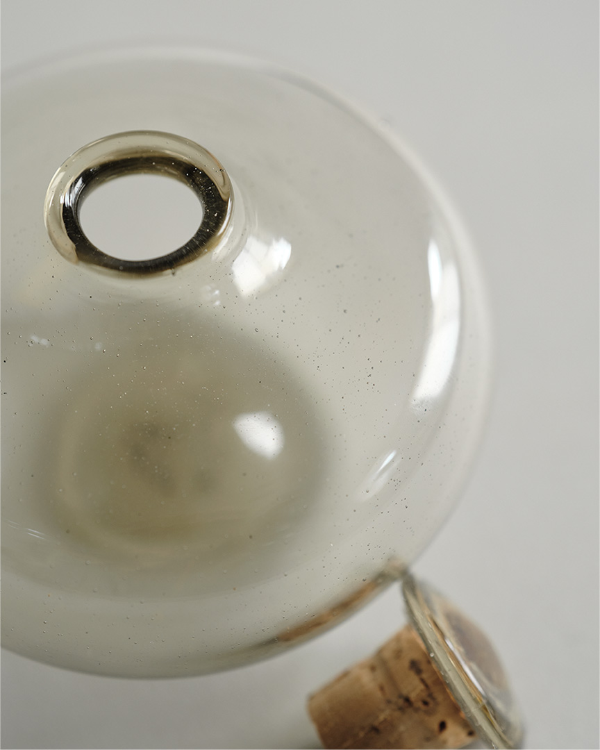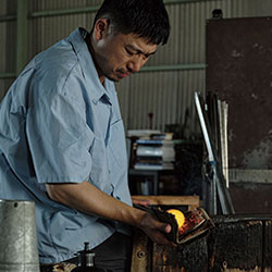 1979年熊本県⽣まれ。富⼭ガラス造形研究所を卒業後、東京のガラス⼯房で5年、富⼭の第三セクターのガラス⼯房で10年勤務。当初、富⼭界隈で広い作業場を探していたが、たまたまネットで⾒つけたのが現在の場所だったという理由で、2015年岐⾩県に移住。つくるものは、器や花器など使えるものが多いが、基本的に使いやすさは⽬指していない。「薄いものは1mmくらいですから。使おうと思えば使えますけどね」という。
