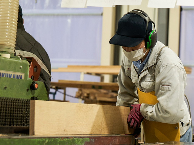 丸太から製材された板を、製品の大きさに合わせて切り分けたり、テーブルの天板など大きな部品を製作するために板を接着しています。