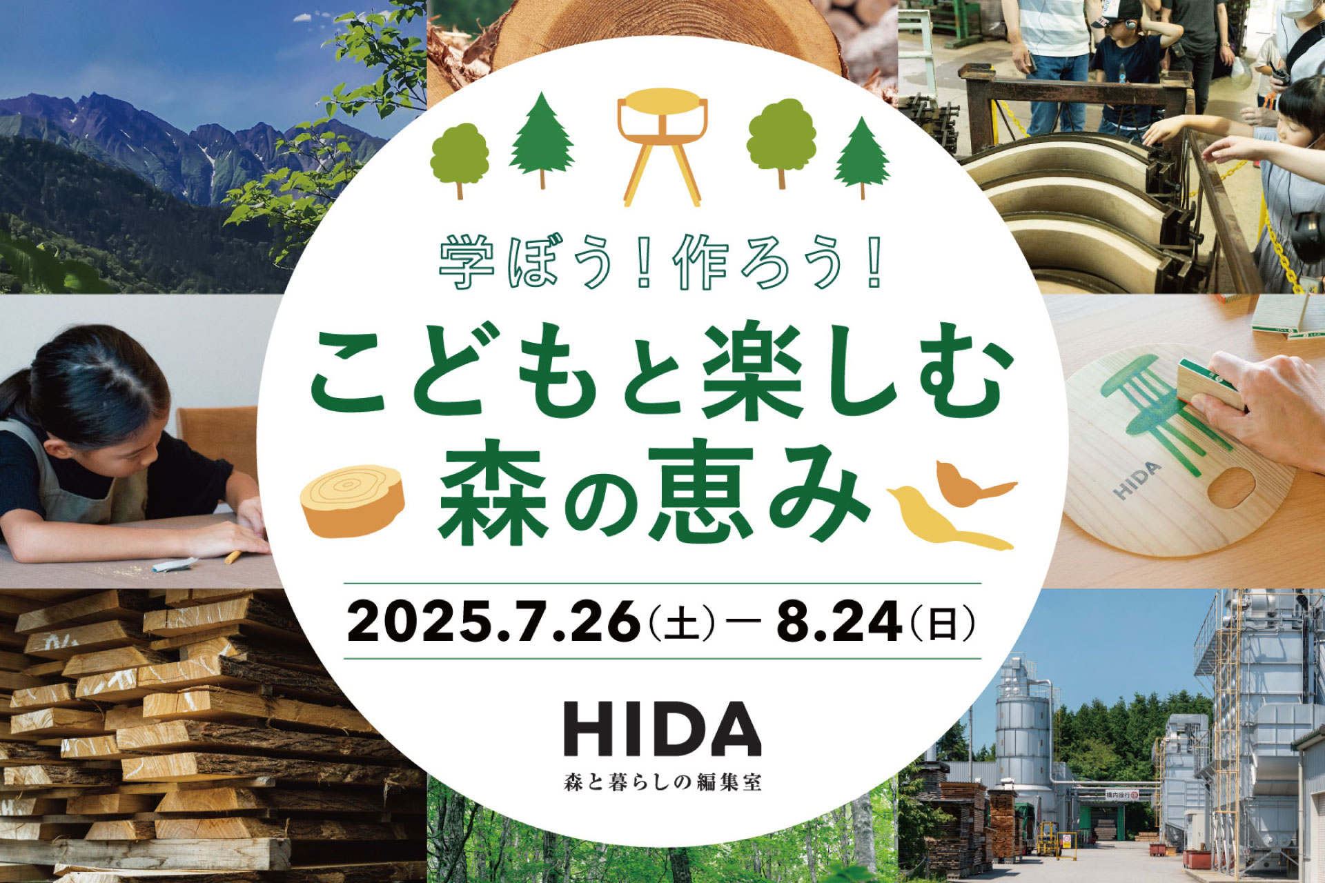 夏休み特別企画として7月26日(土)から8月24日(日)まで子供と一緒に楽しめる催しや家具工場見学ツアーなど、自由研究にも活かせる体験プログラム「こどもと楽しむ森の恵み 2025」を開催します。木に触れて楽しみながら森の豊かさやSDGsについて学べるこの機会にぜひご参加ください。