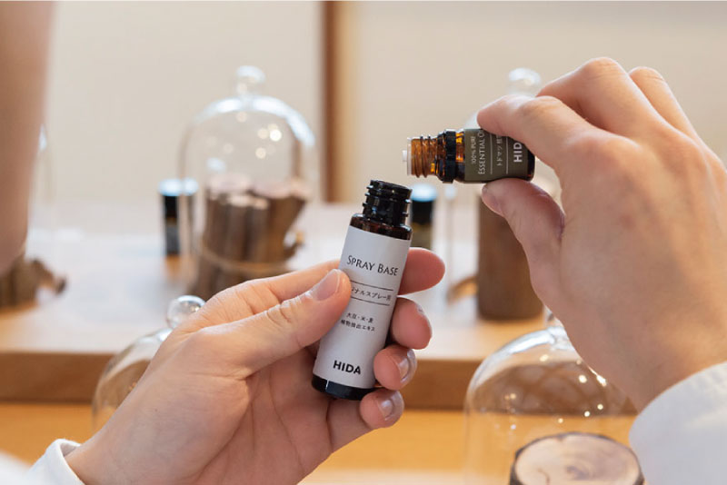 森の香りの研究所に並ぶ、樹木などから抽出した天然の精油の中から、好きな香りをブレンドして自分だけのオリジナルアロマスプレーがつくれます。HIDA 高山店ではWeb限定商品の精油も選べます。