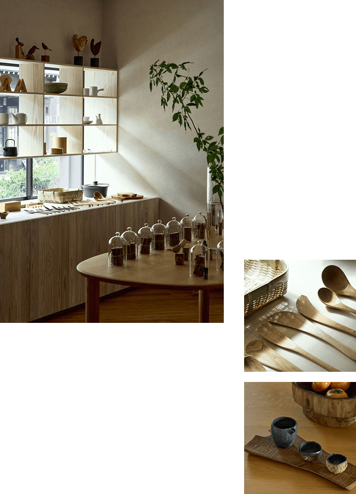 木のぬくもりと手仕事のある暮らしの豊かさを提案するショップです。HIDAオリジナルの家具や森の香りをとじこめたアロマ、地元作家を中心とした工芸など、暮らしを彩る品々を取りそろえました。また、ショップ内に併設された「匠の道具棚」では、木工具の販売やワークショップの開催など、木工具の紹介をはじめ木工技術の継承と普及にも取り組みます。