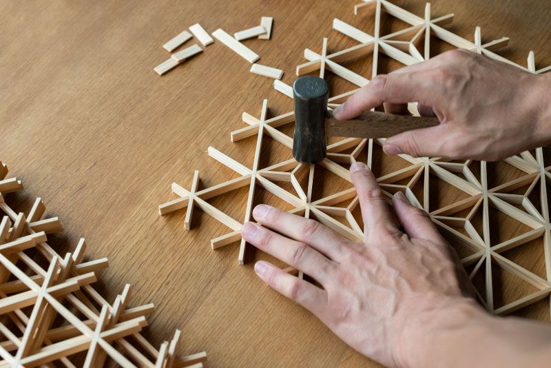 家具工場にて飛騨の家具がつくられるまでを見学し、その後、講師指導のもと釘を使わずに細い木片を組み合わせ、緻密な模様を編み出す伝統的な木工技術「組子」を体験しながら、コースターを完成させます。